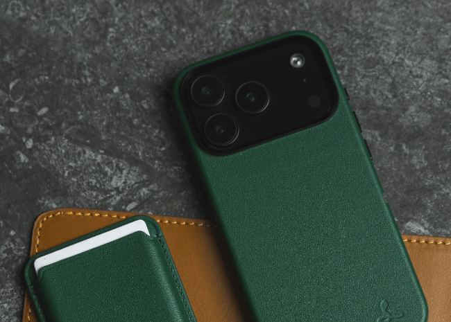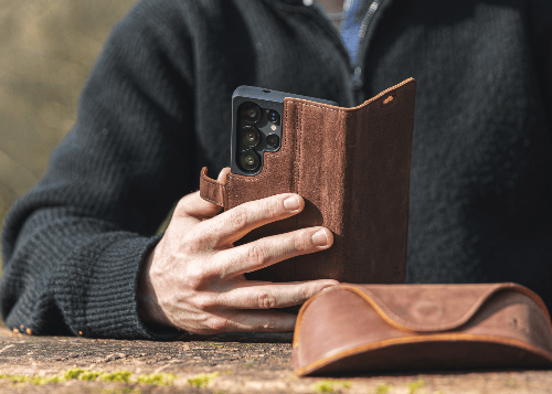 Handcrafted in the UK, each phone case is a quiet statement. Choose from matte classics like Black, Bottle Green, Navy and Titanium Grey in nubuck leather, or go bold with Plum, Teal and Chestnut Brown in full-grain leather. A perfect blend of craftsmanship and capability – just like the phone it protects.