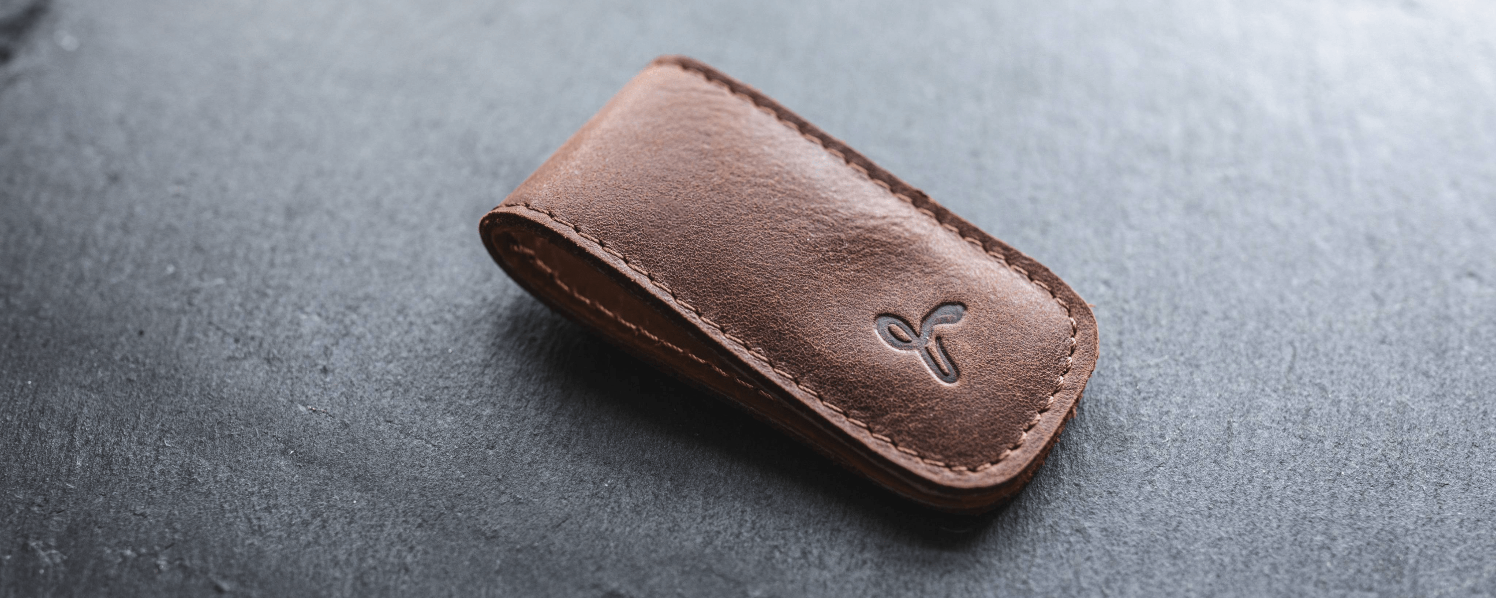Designed to hold your notes securely without the fuss of a full wallet, this sleek money clip slips easily into your pocket while still making a subtle statement. The soft, matte leather develops a rich, individual patina over time – a mark of quality that tells your story, not just the time.